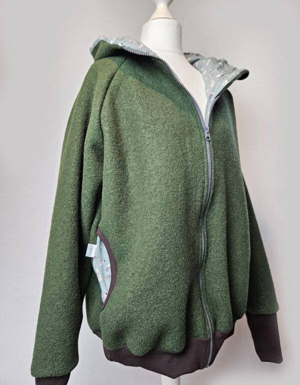 Damenjacke aus Walk waldgrün, Jersey grün-grau mit Federn