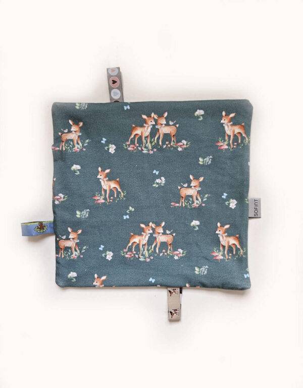 Knistertuch Vorderseite: 95 % Bio-Baumwolle, 5 % Elasthan, Bio-Jersey grün mit Reh, Organic Quality, GOTS-Zertifiziert, Öko-Tex 100 Europe